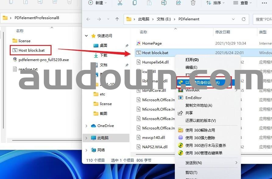 打开安装包,将Host block.bat放到安装目录下,并以管理员身份运行。默认安装目录:C:\Program Files\Wondershare\PDFelement
