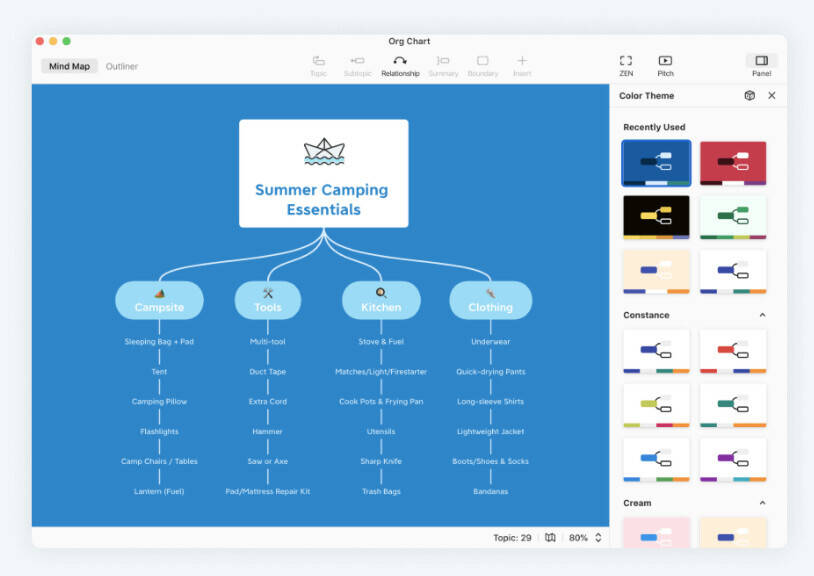 颜色主题:色彩主题带来更多可能。现在,您可以立即切换和查看它们,同时轻松构建优雅的思维导图。